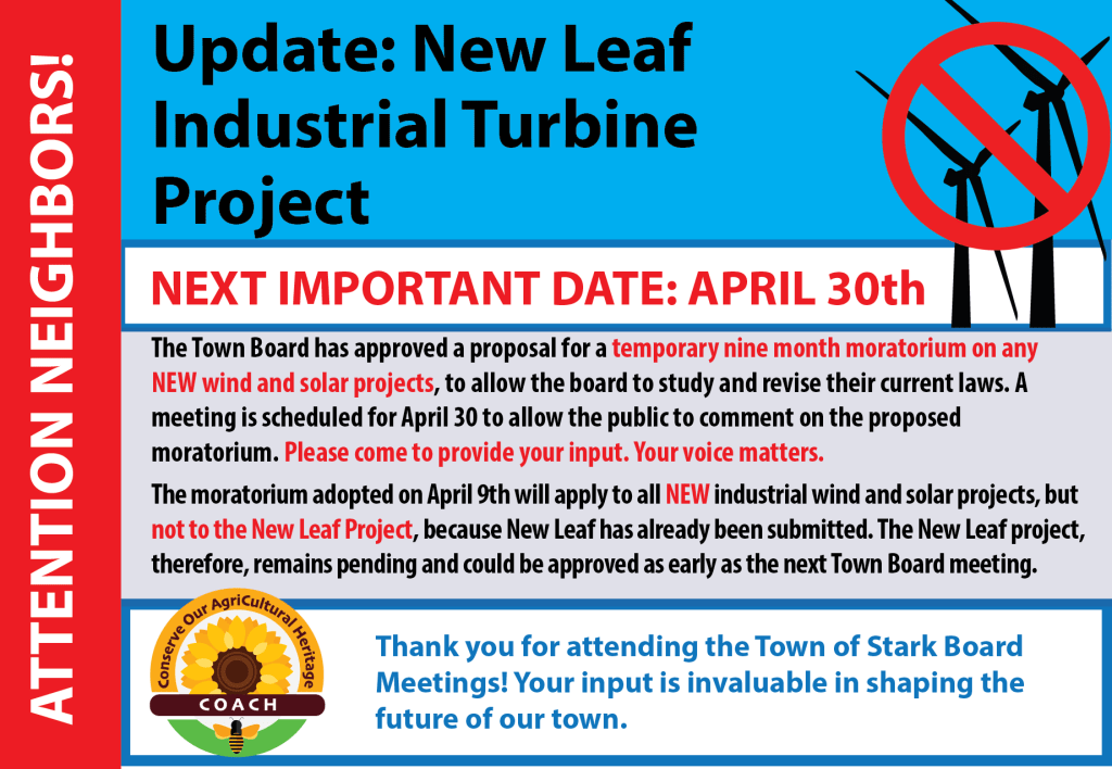 The moratorium adopted on April 9th will apply to all NEW industrial wind and solar projects, but not to the New Leaf Project, because New Leaf has already been submitted. The New Leaf project, therefore, remains pending and could be approved as early as the next Town Board meeting.