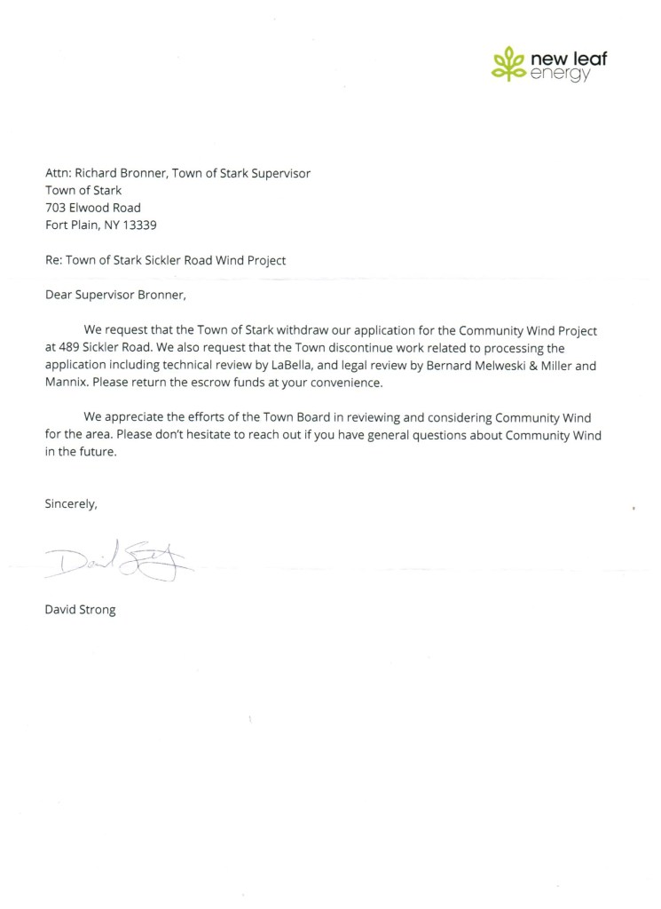 New Leaf Energy has withdrawn their permit application to the Town Board for construction of a two turbine community wind project that was to be located on Sickler Road in the Town of Stark. Thanks to the prayers and assistance of all involved.
